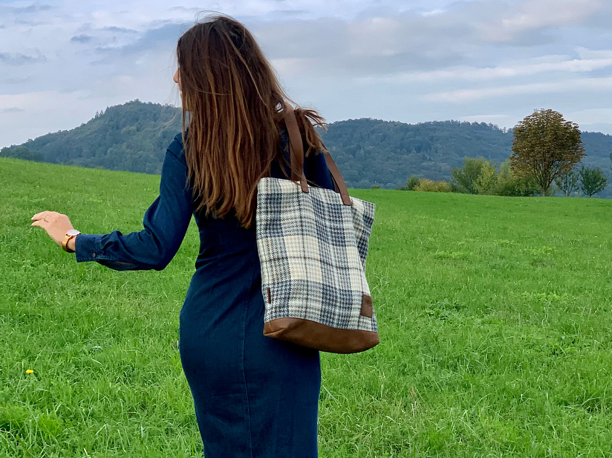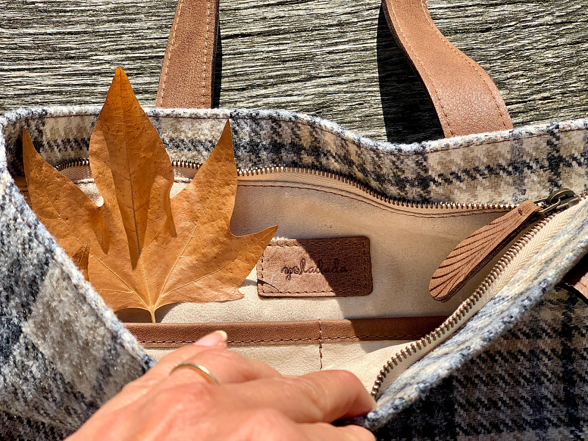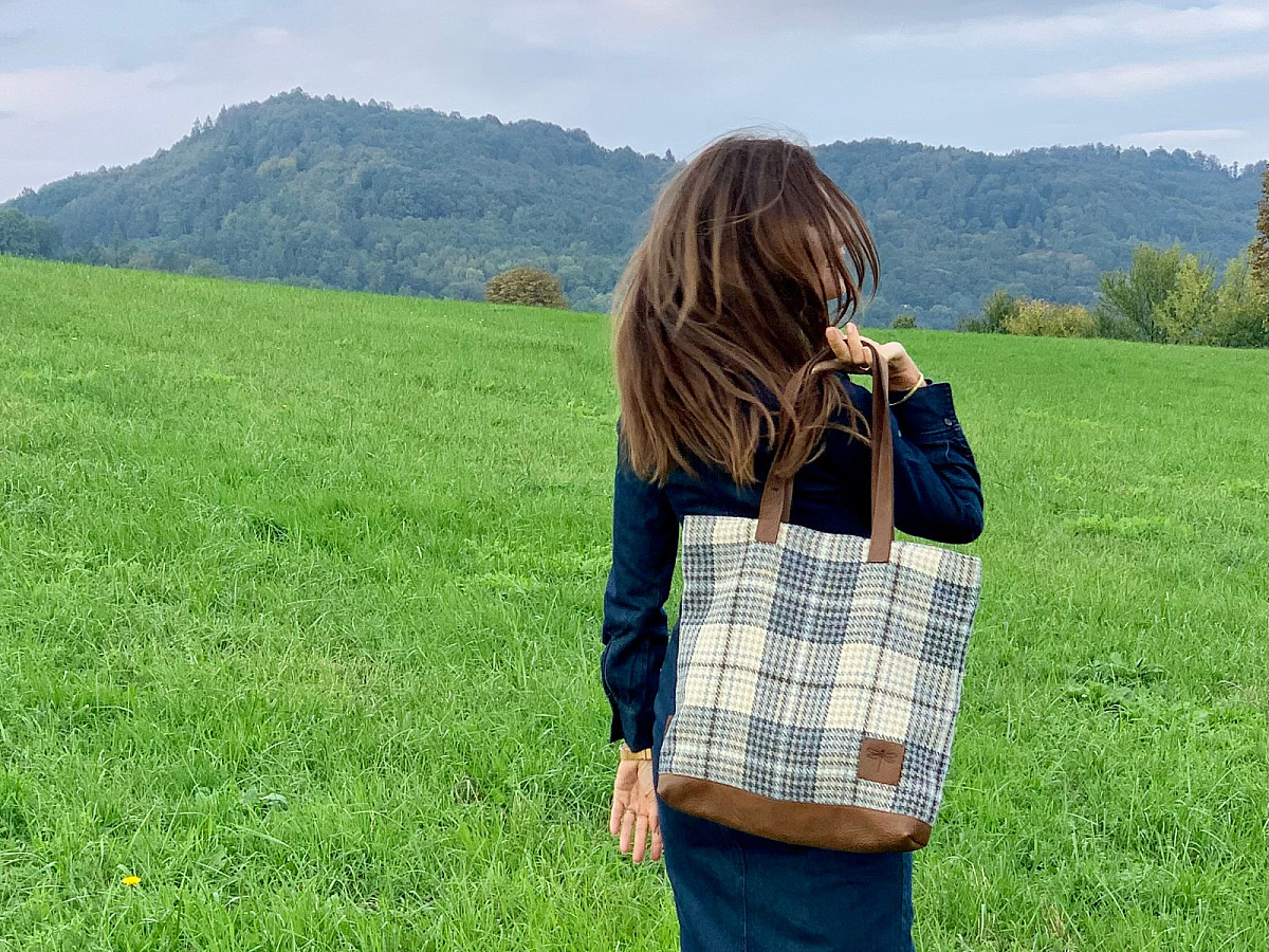 Kabelka LUNA je ušita z italské hověží kůže, v kombinaci s látkou, která svým vzorem připomíná manšestr.