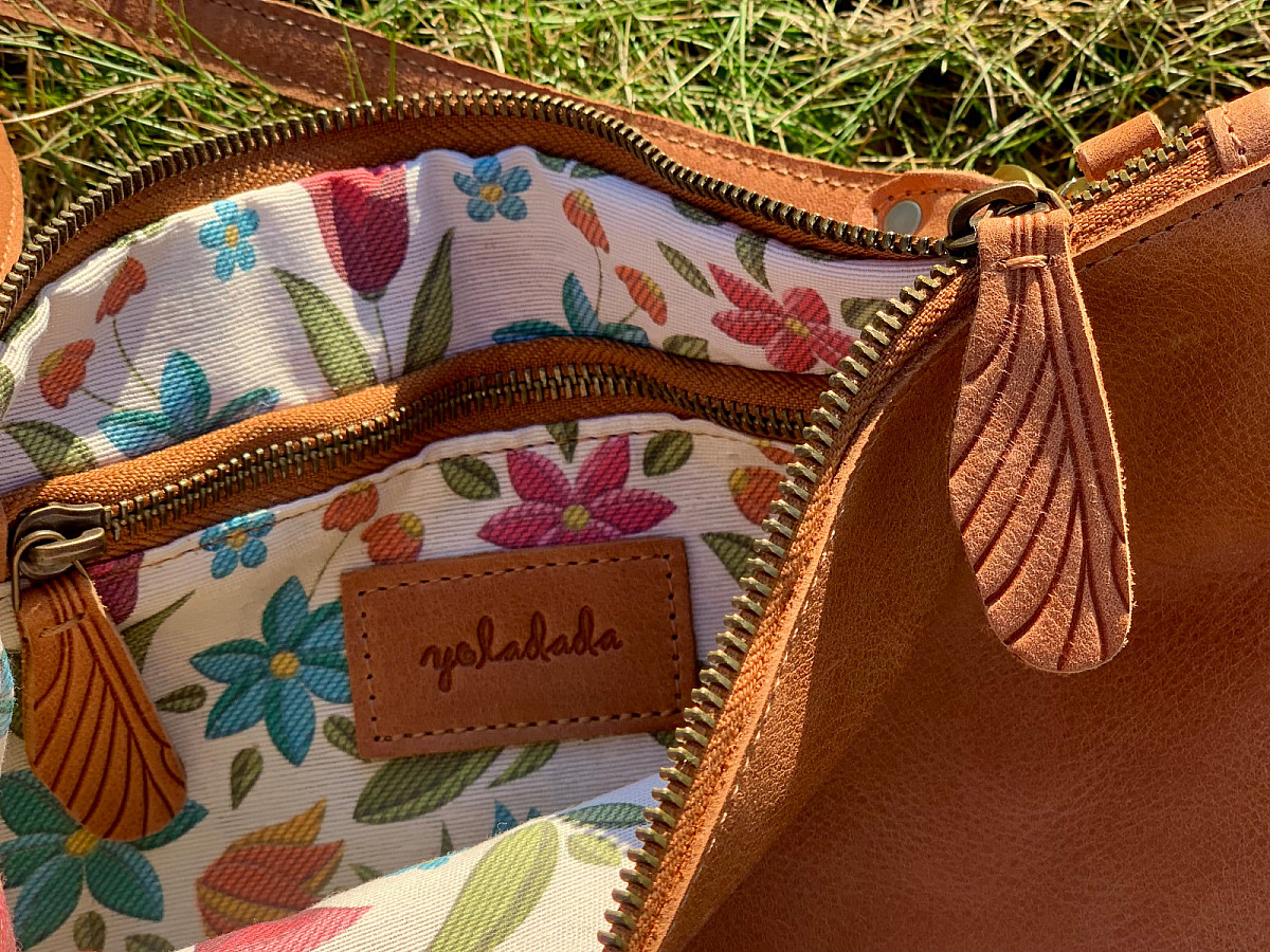 Krásná italská kůže SPIDER, ze které je kabelka SIMONE ušita, je nadčasová a v koňakové barvě s krásnou květinovou podšívkou, neodolatelná.