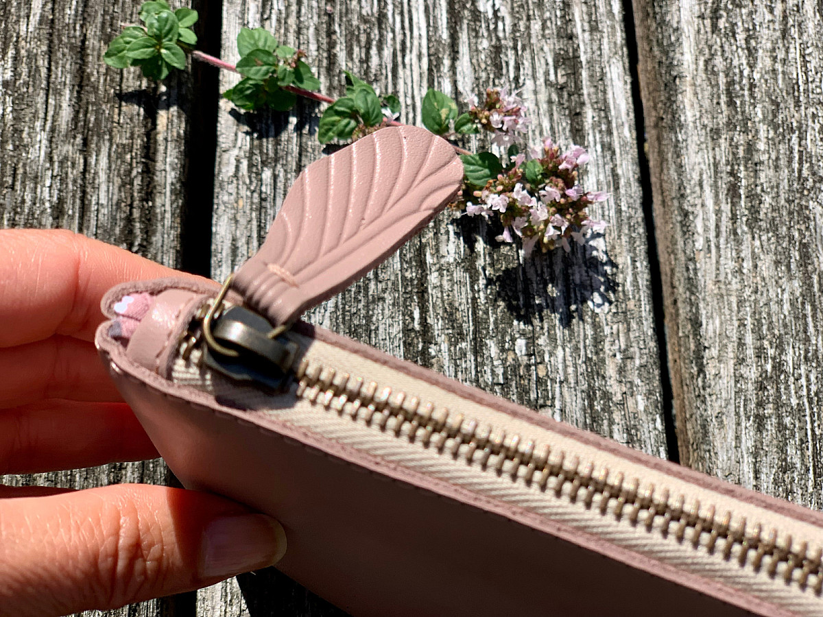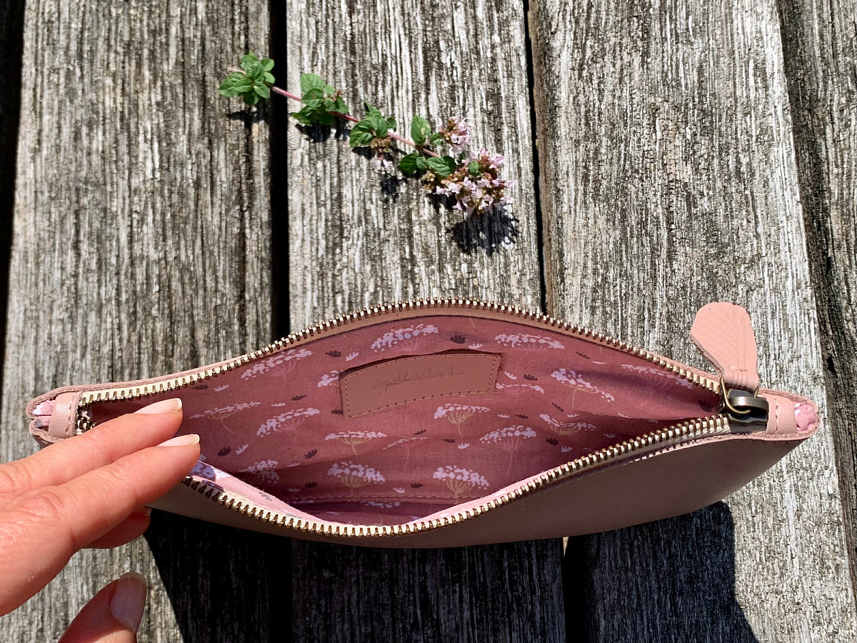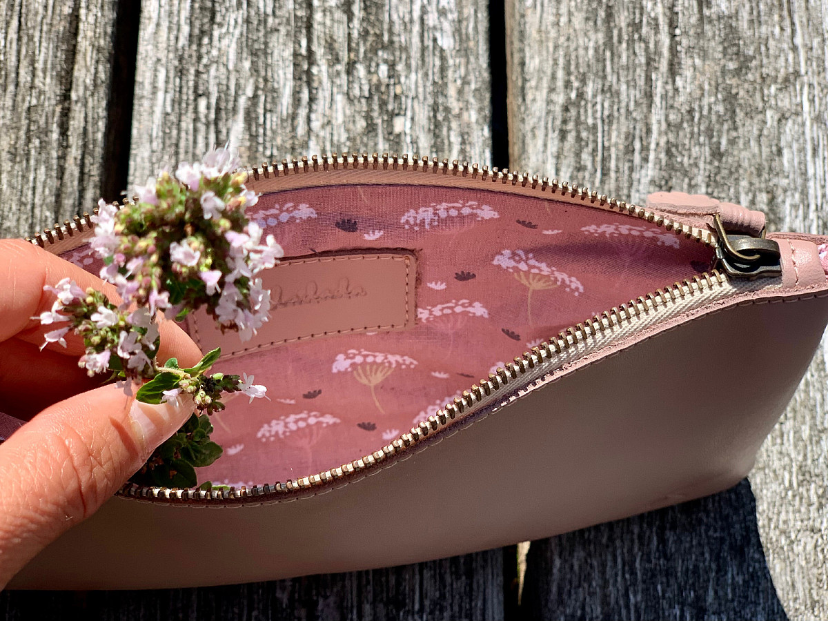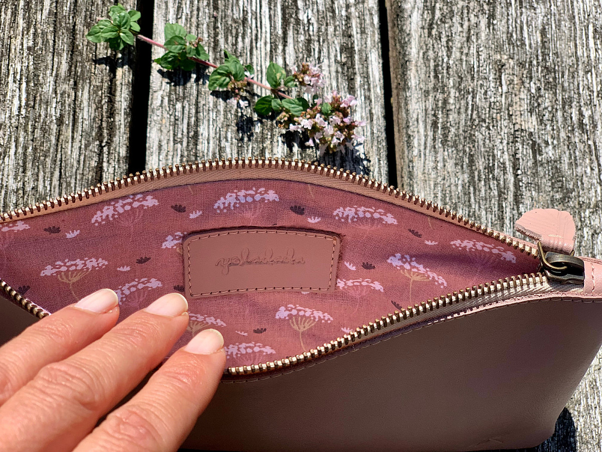 Béžový zip, pudrová kůže i podšívka s jemným vzorem kmínu, dodává pudrové Lenny jemný a nadčasový vzhled.
