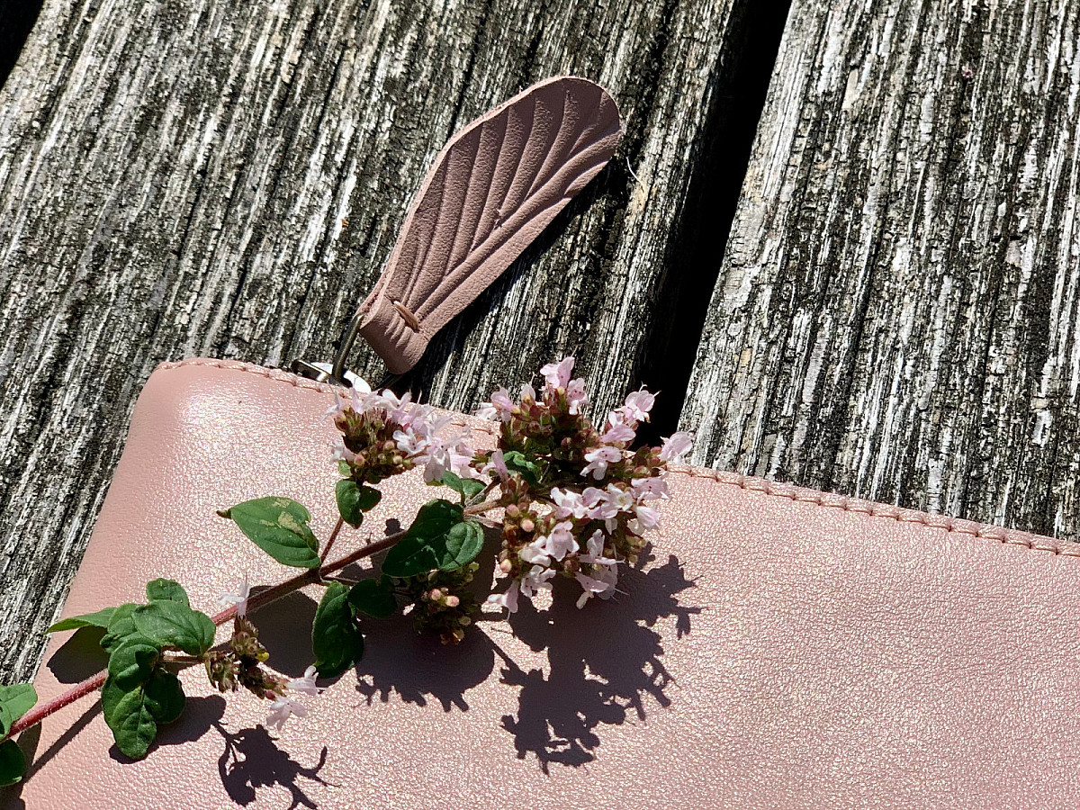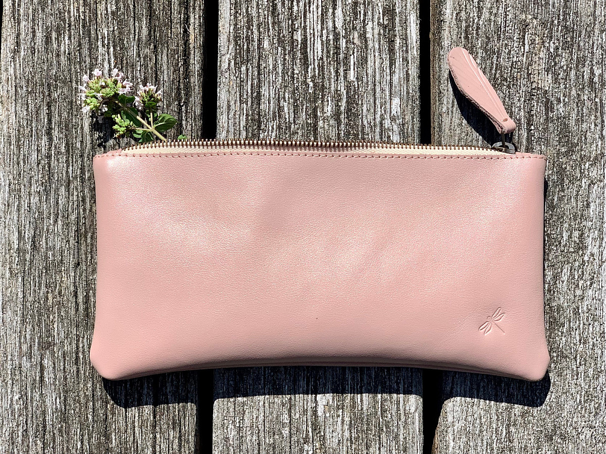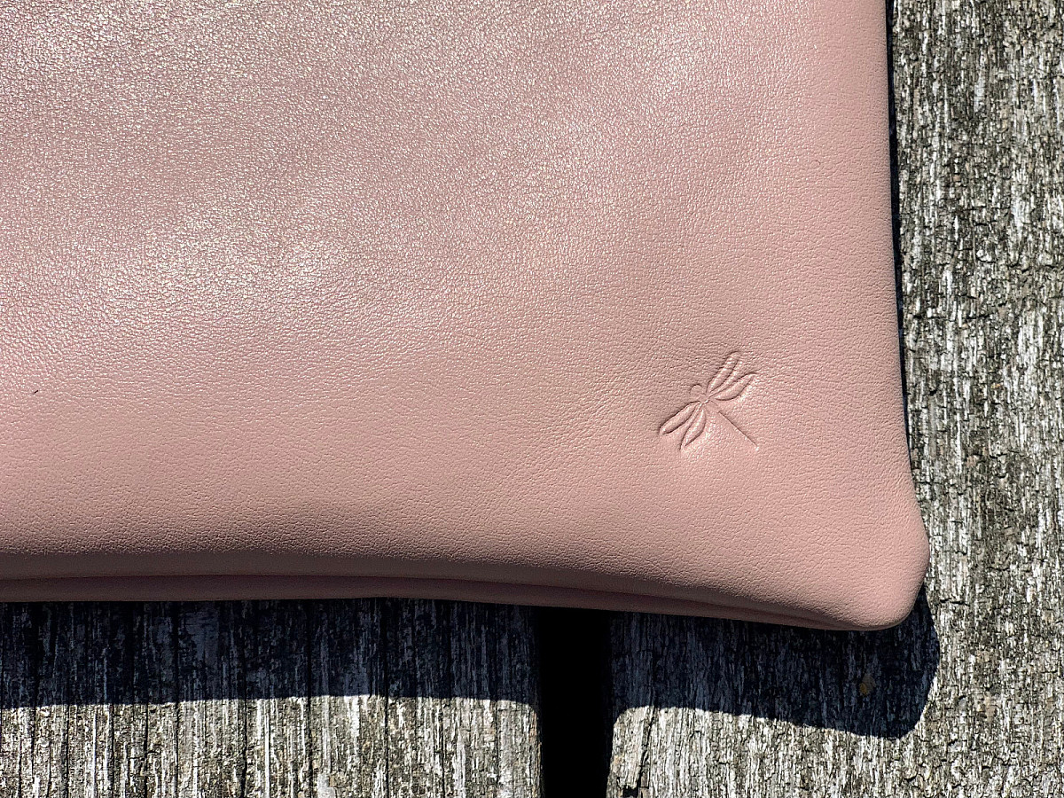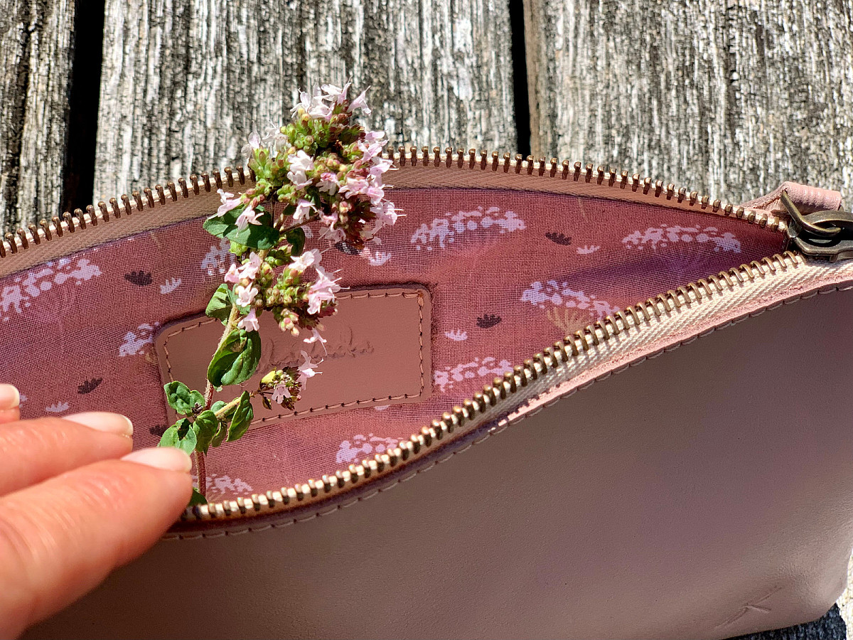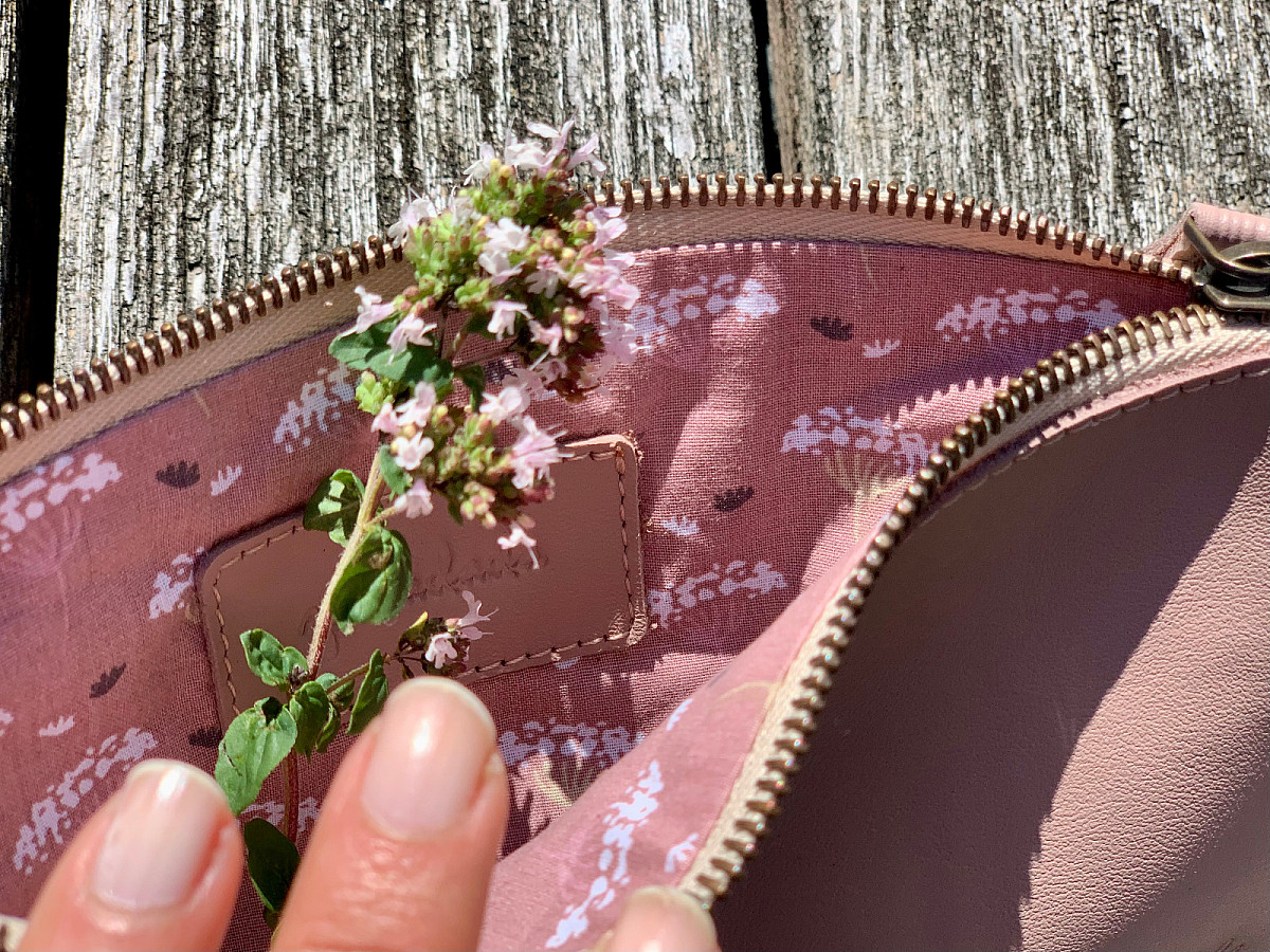 Béžový zip, pudrová kůže i podšívka s jemným vzorem kmínu, dodává pudrové Lenny jemný a nadčasový vzhled.